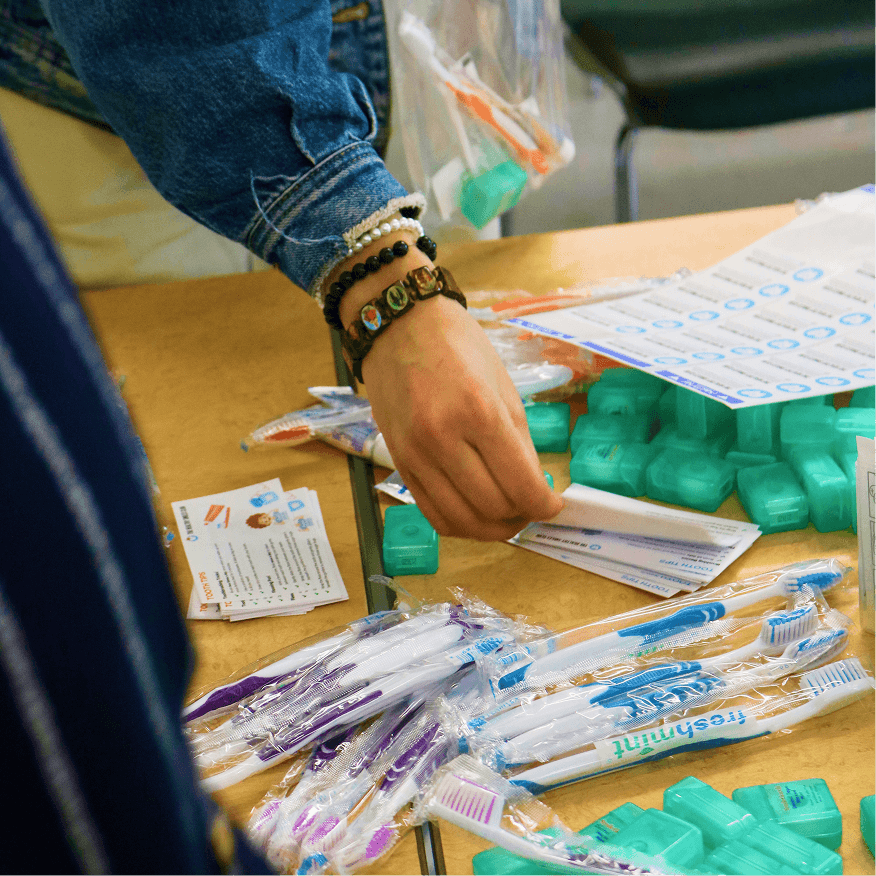 Toothbrushes, toothpaste, floss, and education cards distributed to shelters and community organizations.